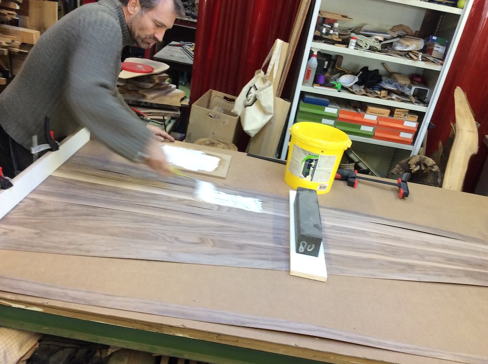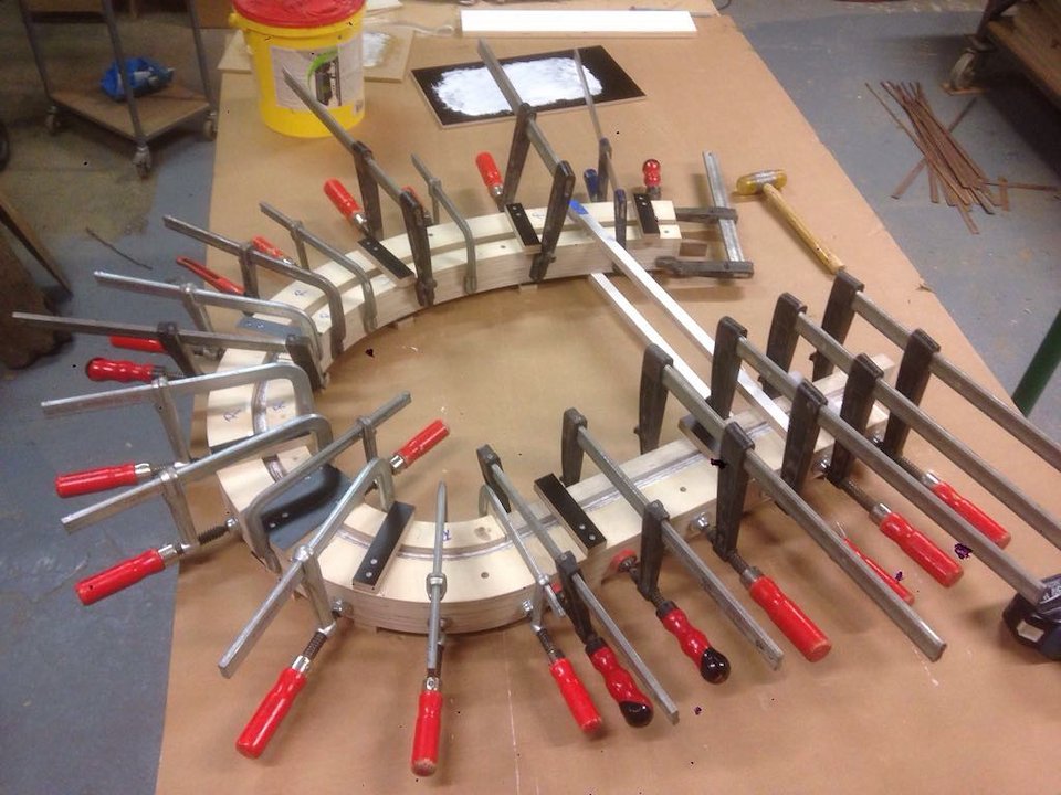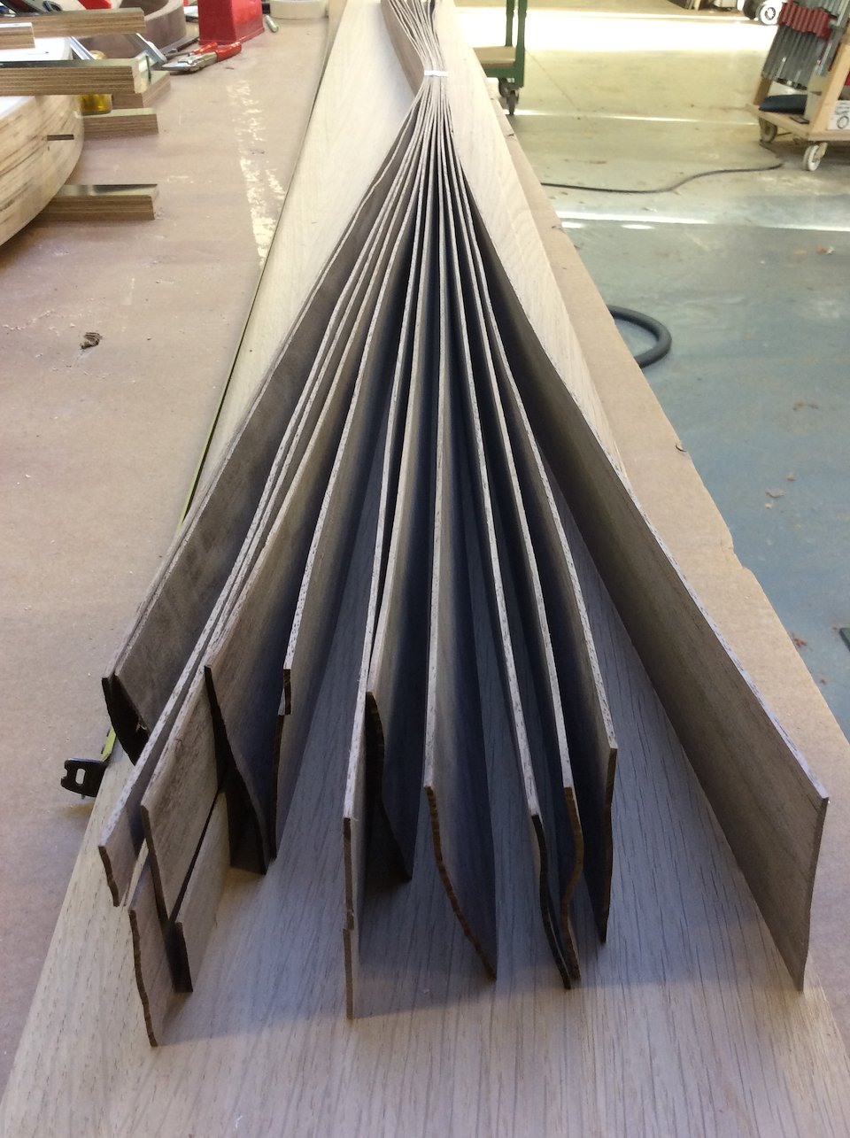 Het paket aan fineerstroken wordt in een mal met contramal gelegd en met lijmtangen vastgeklemd.