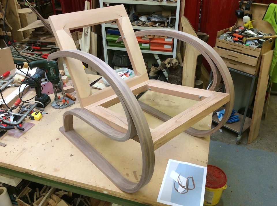 Voorbeeld was en is de La Maitrise stoel uit 1925 met dank aan Bart Bisscheroux (collega meubelmaker), Peter Roschar (stofferder), Mila van Egmond (fotografe) en initiatiefnemer en ontwerper Alice Moritz (meubelmaker).
