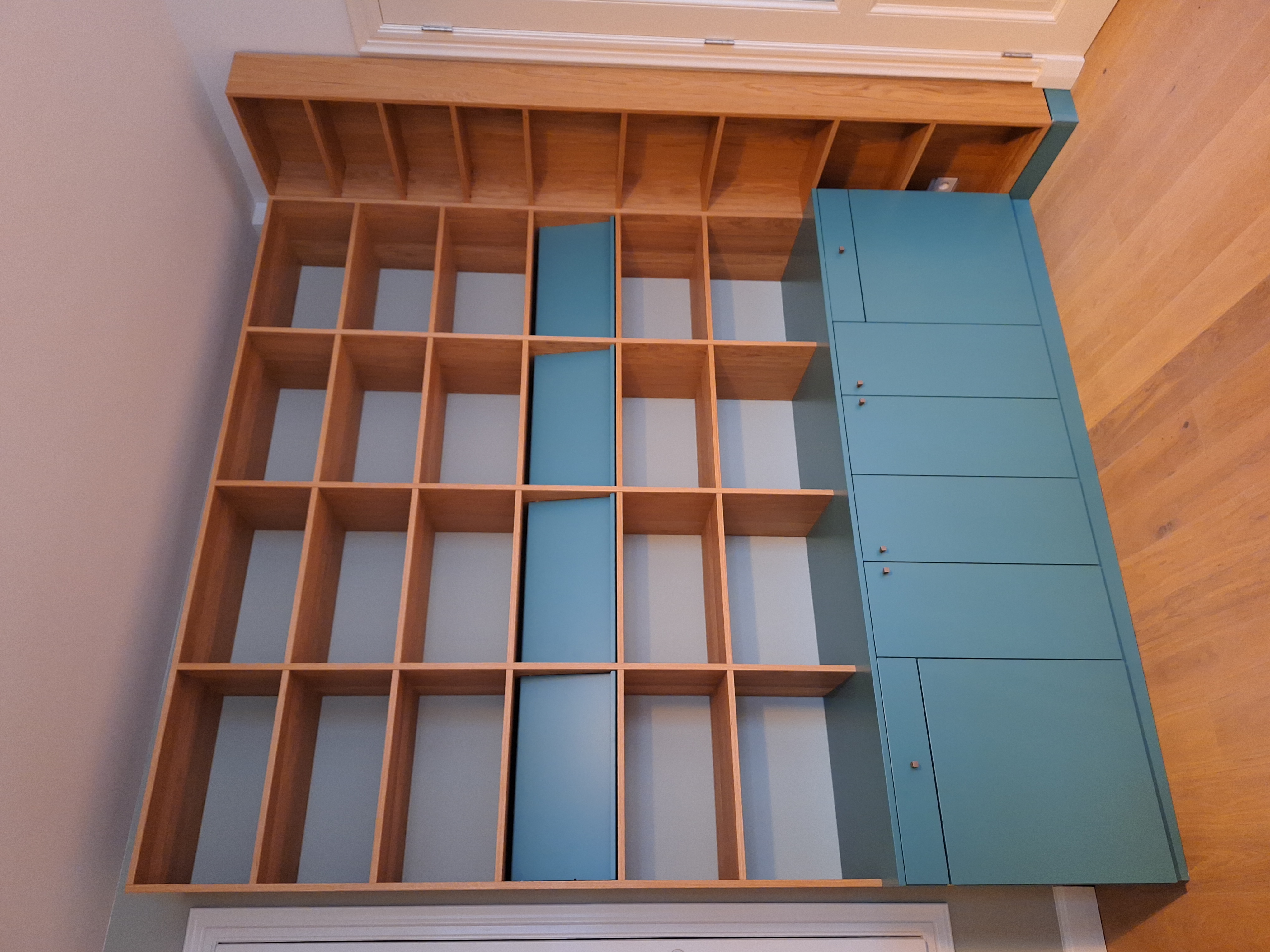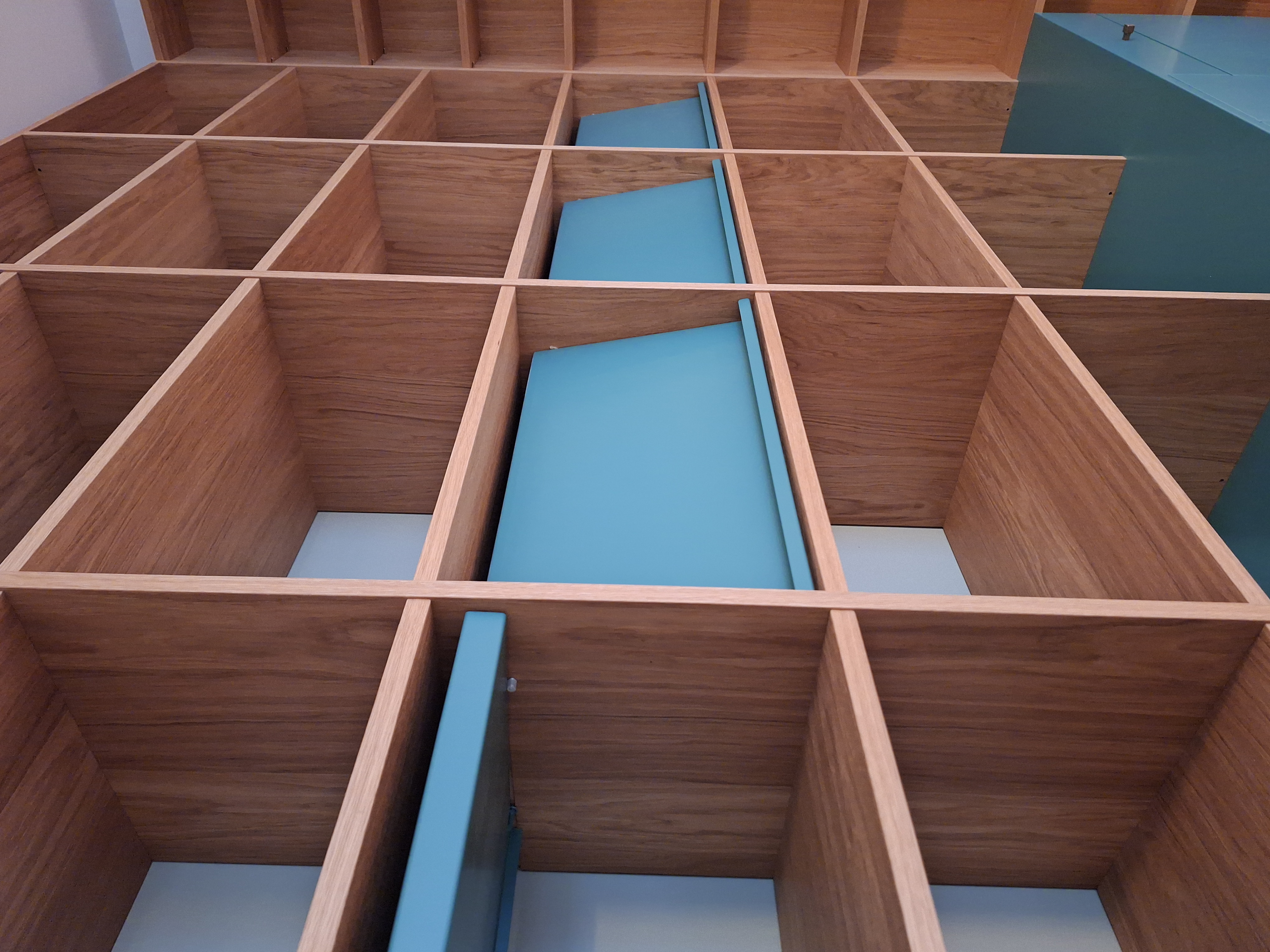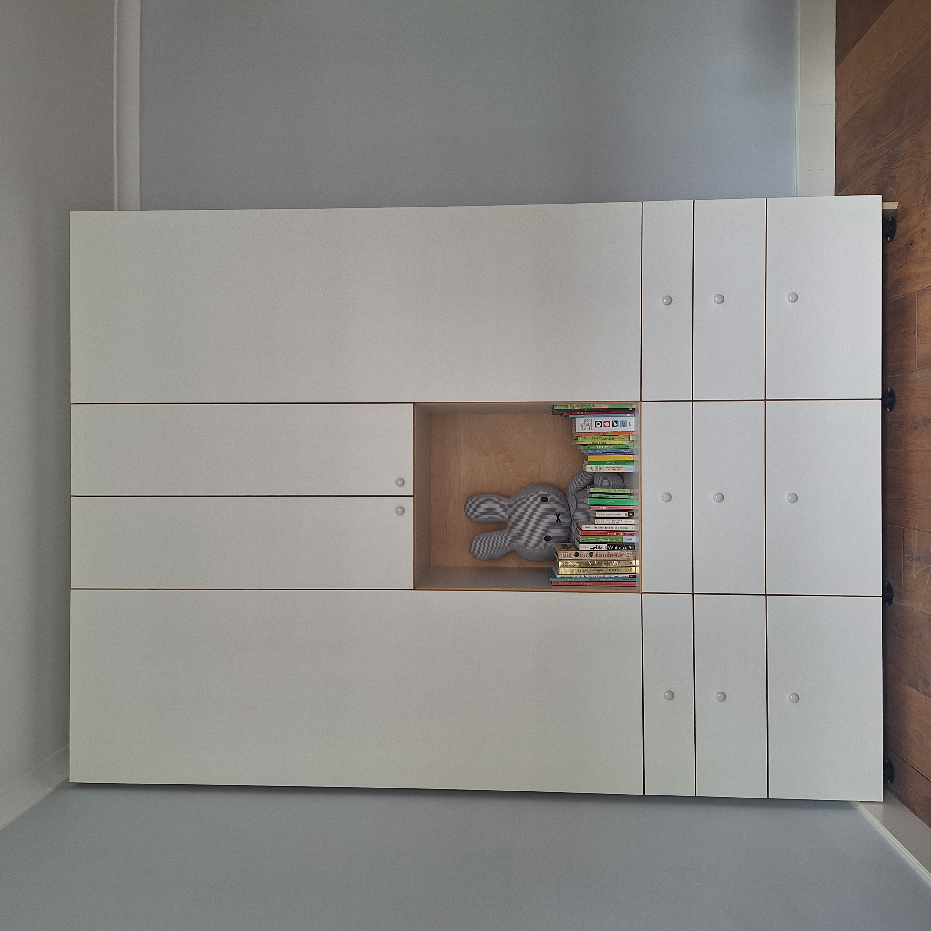 Woonkamerkast met gelakt berkenplex en gekleurde fronten