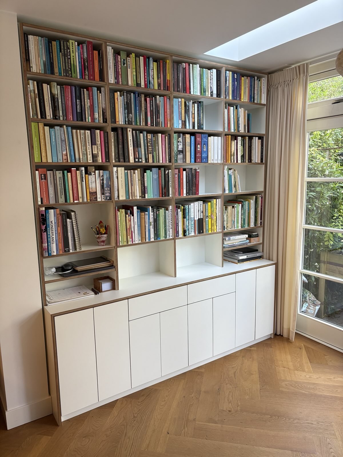 Boekenkast van Berkenmultiplex gelakt, 220x60x40cm.